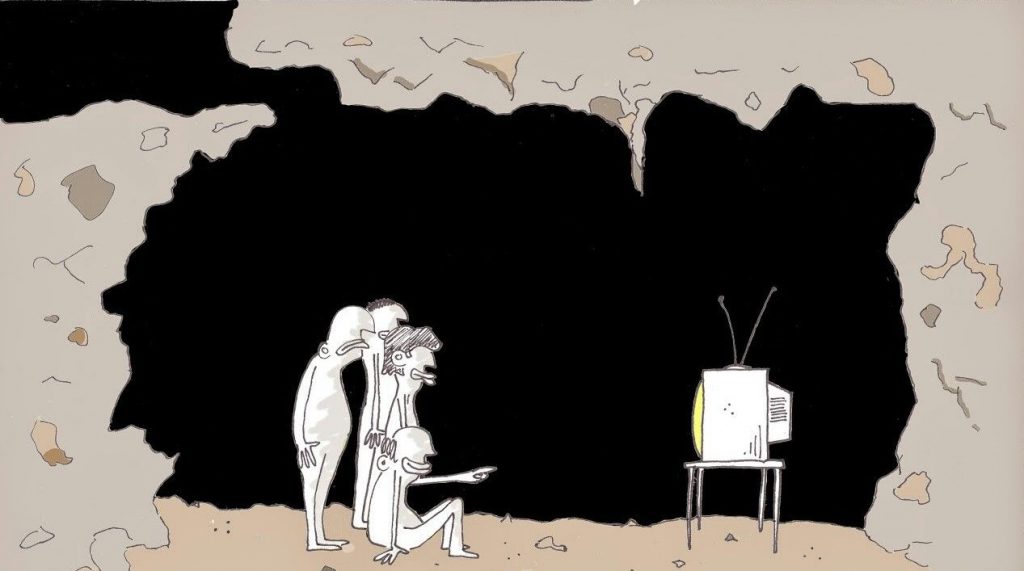 …En su Alegoría de la caverna, Platón simboliza como un grupo de personas, encadenadas y sin poder girar la cabeza, pueden vivir eternamente una realidad falsa representada por las sombras que, sobre una pared, otras personas se encargan de proyectar, personas que sí tienen el privilegio de vivir la verdadera realidad. Podemos extrapolar en el tiempo el relato de Platón y decir que argentinos y argentinas somos el grupo de personas encadenadas y mirando una pared que es la economía, que el discurso del poder dominante son las sombras que vemos y así concluir que la pared y las sombras de la caverna se parecen mucho a la realidad económica que nos hacen vivir.